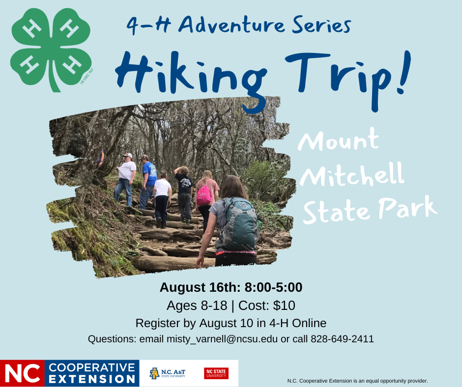 August 16th: Hiking at Mount Mitchell State Park, 8:00 a.m.-5:00 p.m., $10. Register by August 10.