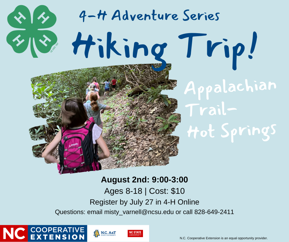 August 2nd: Hiking on the Appalachian Trail in Hot Springs, 9:00 a.m.-3:00 p.m., $10. Register by July 27.