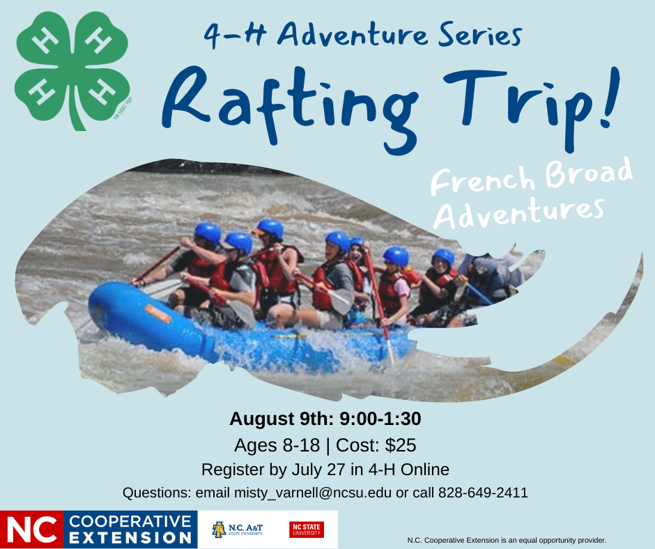 August 9th: Whitewater Rafting with French Broad Adventures, 9:00 a.m.-1:30 p.m., $25. Register by July 27.
