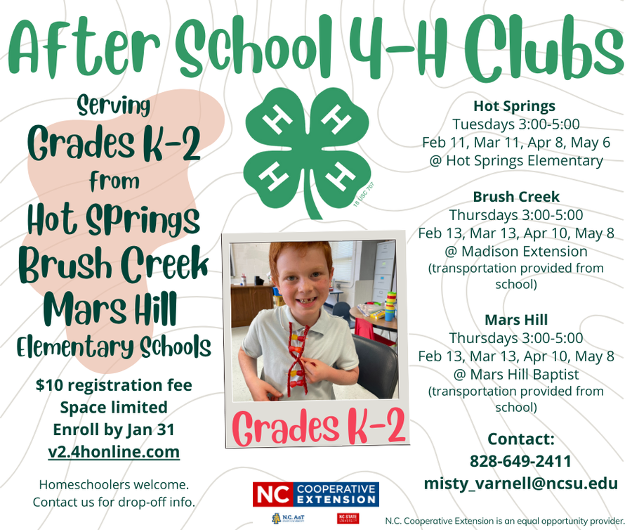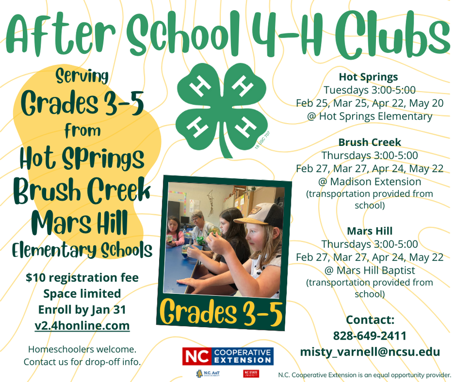 - Brush Creek Elementary / Marshall groups meet at Madison Cooperative Extension Center at 258 Carolina Lane, Marshall on Thursdays from 3:00-5:00pm (BCE students will ride Madison County 4-H Van to 4-H meetings)